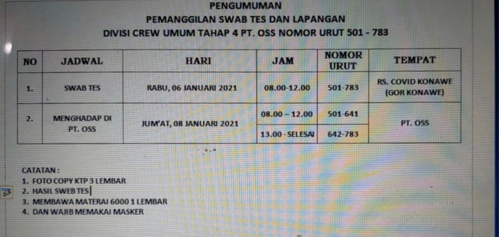 Pengumuman Calon Tenaga Kerja Lokal (CTKL) devisi Crew umum tahap empat PT. OSS untuk melakukan test swab yang akan dimulai dari nomor urut 501 sampai 783 dan jadwal Swab Rabu 6 Januari 2021 pukul 08.00 – 12.00 Wita di Rumah Sakit Covid Konawe di GOR dan ke PT OSS, Jumat 08 Januari 2021 pukul 08.00 Wita sampai selesai.